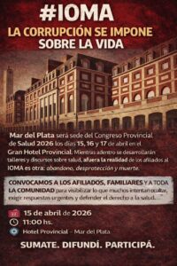 Mar del Plata será sede del Congreso Provincial de Salud 2026 los días 15, 16 y 17 de abril en el Gran Hotel Provincial. Mientras adentro se desarrollan talleres, actividades y discursos sobre salud, afuera la realidad de los afiliados de IOMA es otra: abandono, desprotección y muerte.