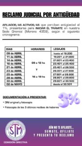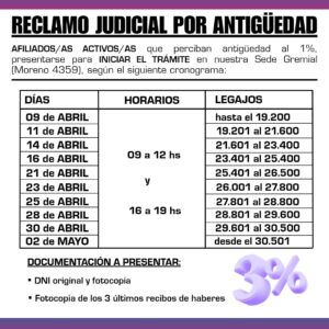 – Afiliados/as activos/as que perciben antigüedad al 1%: Lunes, Miércoles y Viernes, a partir del 09 de abril, según número de legajo.