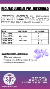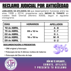 El Sindicato de Trabajadores Municipales de General Pueyrredon convoca a sus afiliados activos y jubilados a presentarse en su Sede Gremial (Moreno 4359) para iniciar el trámite de reclamo judicial por antigüedad.